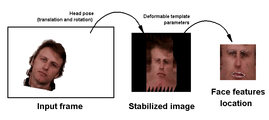 Our approach to facial features reconstruction is a two stage process, which separates the head tracking from the reconstruction of the facial features. First, a 3D textured polygonal model is fitted to an image sequence acquired using a single and non-calibrated camera. The model texture is initially reconstructed directly from the input image as the 2D texture which matches the rendered model and the video image. The fitting process exploits both motion and texture information. Motion information is obtained evaluating the optical flow between two consecutive frames, while texture information is gathered warping the image frame in the texture space of the model. After pose reconstruction, each input image is projected on the texture map of the model. The image obtained provides a stabilized view of the face, that is an image where the face has always the same position, orientation and size, which is processed to reconstruct significant face features, like eyes, brows and lips. Feature detection and tracking uses a set of multi-state deformable templates which are fitted to the warped image exploiting motion, shape and color information. The shape parameters of the templates are then output as face animation parameters. Combining the result of both phases, it is easy to obtain a standard animation parameters stream, i.e. an MPEG4 stream.