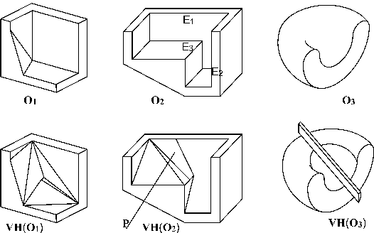In some cases however, the surface of VH(O) includes curved ruled patches, as shown in Fig. 2. For simplicity, we will not deal with this cases. The algorithm, implemented for virtual polyhedra, consists of four parts: