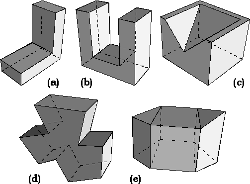The algorithm has been applied for reconstructing the visual hull of several other concave polyhedra. In Fig. 9 we show some polyhedra coincident with their visual hulls and thus, in principle, exactly reconstructable. Our algorithm was able to reconstruct objects (a),(b), (d) and (e) with 16, 19, 43, 19 silhouettes respectively. The concavity of object (c) requires an infinite number of silhouettes. However, its hard edges, including the rim of the concavity, have been determined with 25 volume intersections.